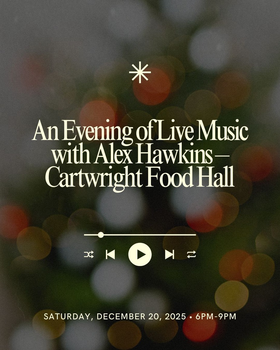 Celebrate the season with Alex Hawkins LIVE upstairs at Cartwright Food Hall — our final live music night of the year!
