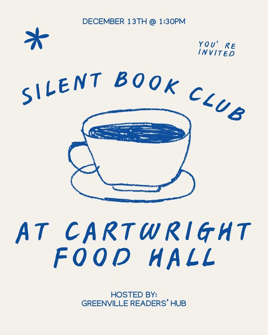 Join us for Silent Book Club with Greenville Readers’ Hub at Cartwright Food Hall! Bring your own book, enjoy good vibes, and connect with fellow book lovers—quietly. Vendor Pop Up: Postage Coffee & Freshly Picked Books